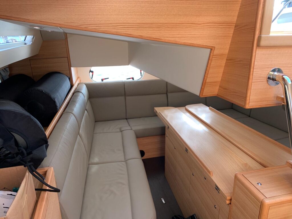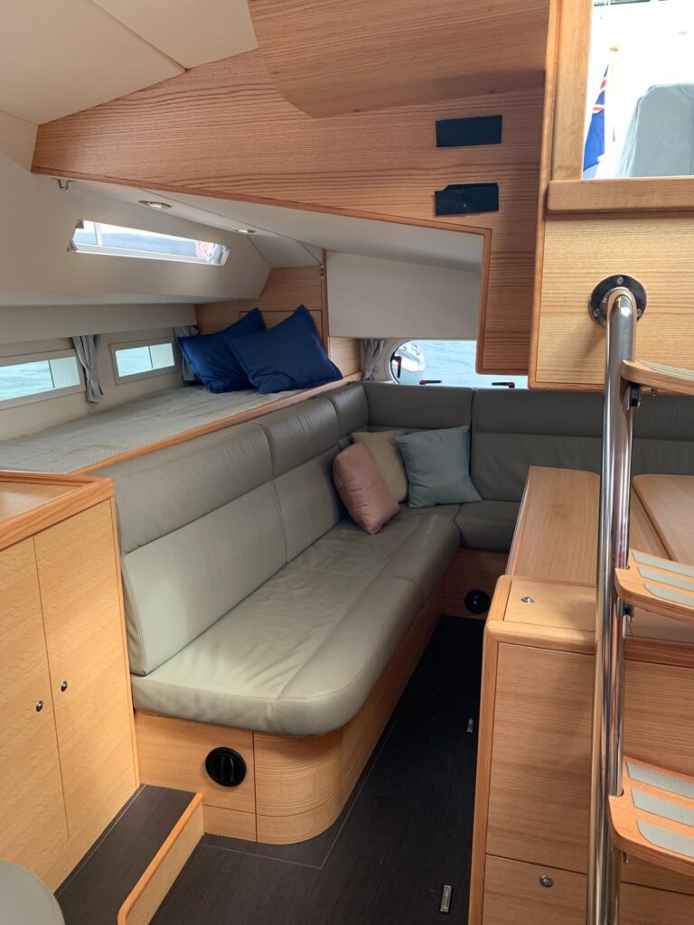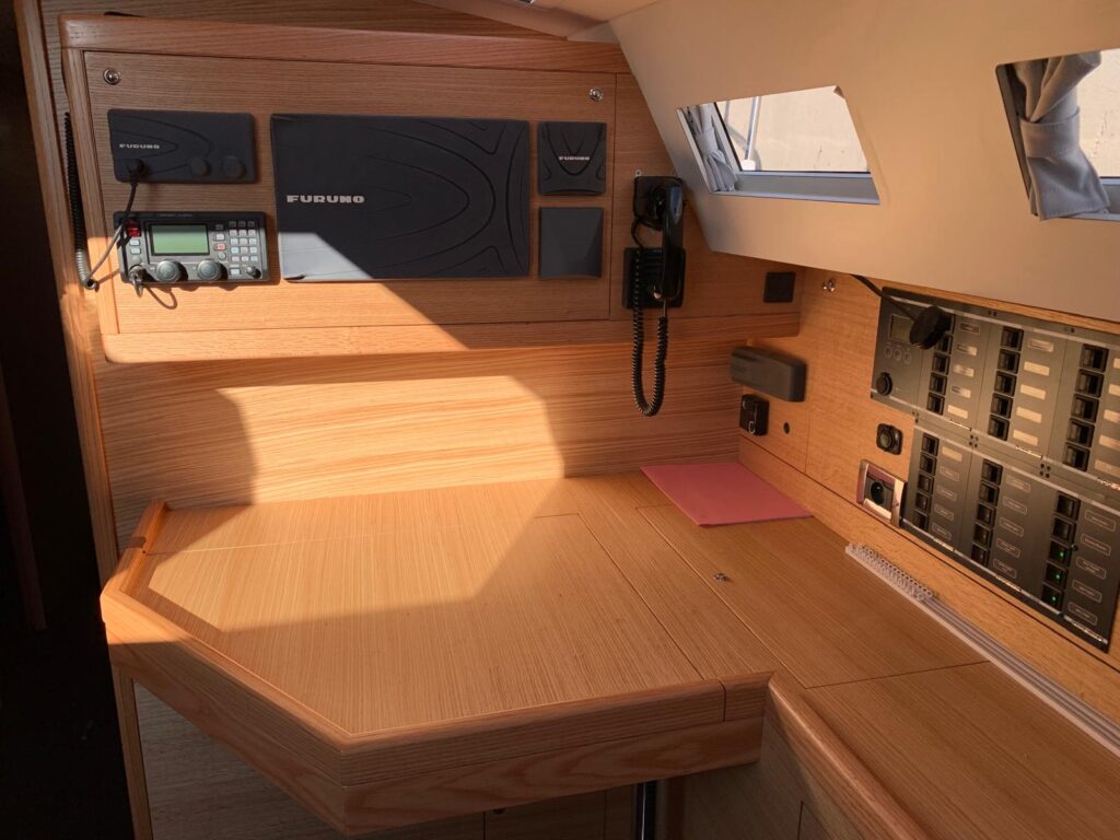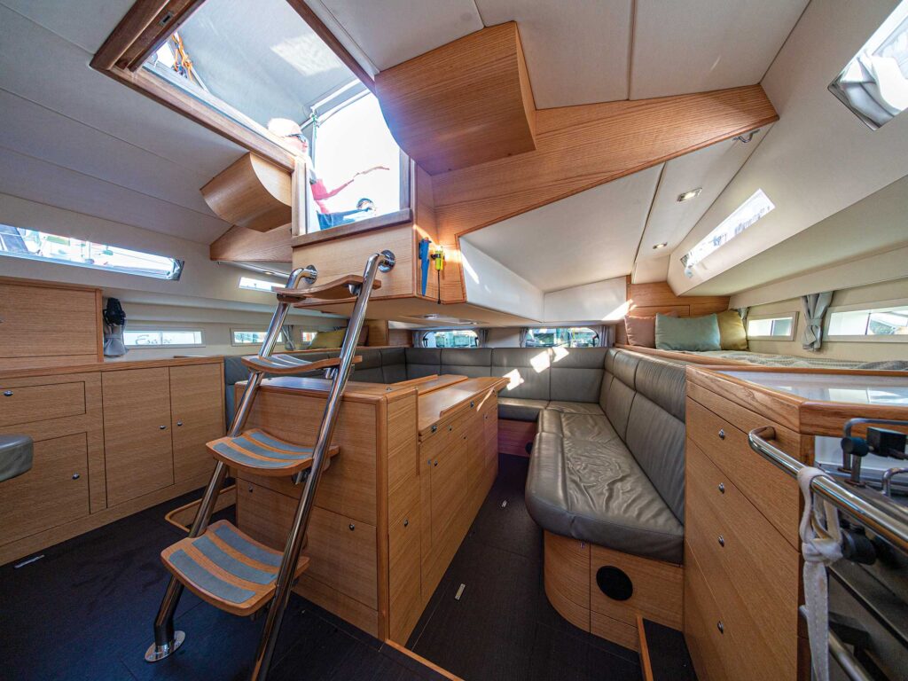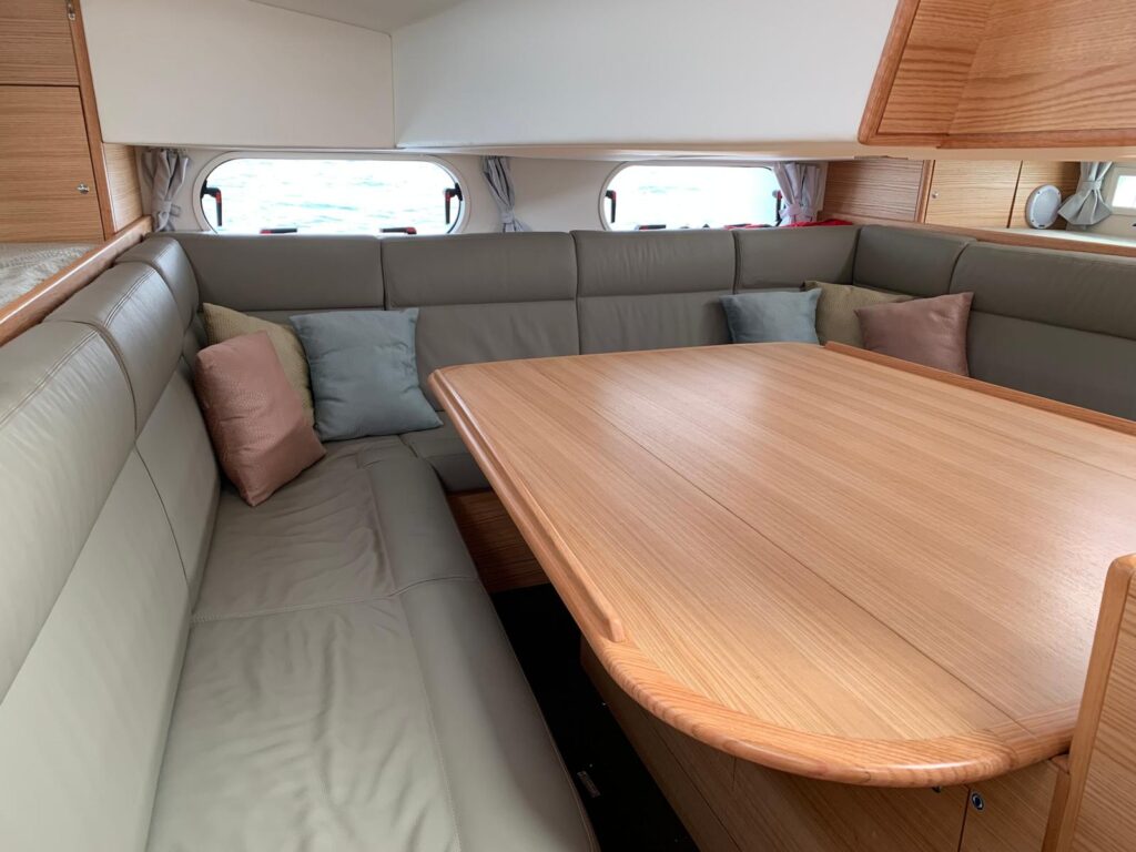 Down below in a high quality and very modern light oak and leather interior there are three cabins and two heads in the forward sections aft of which is the galley and chart table leading to the aft saloon, with a very accessible Volvo diesel housed below the huge dining table.