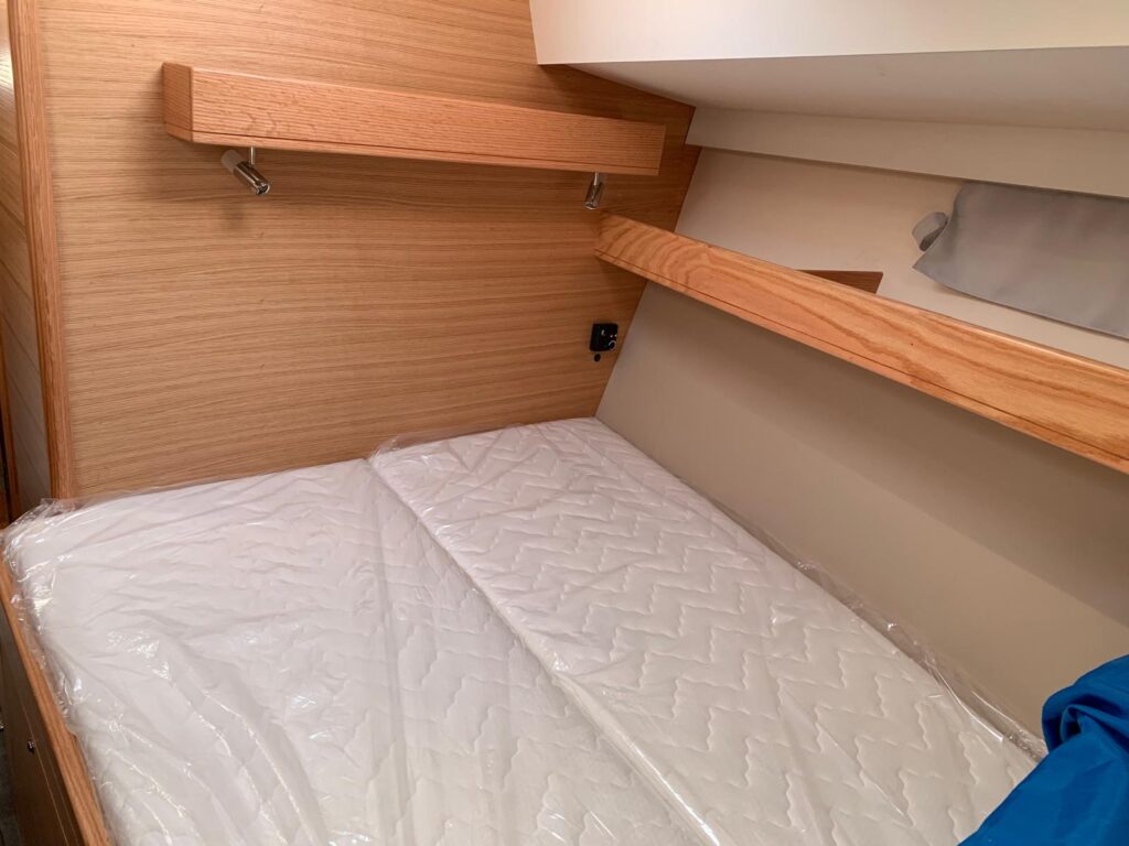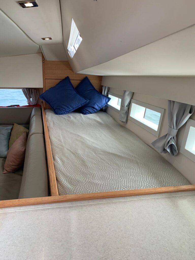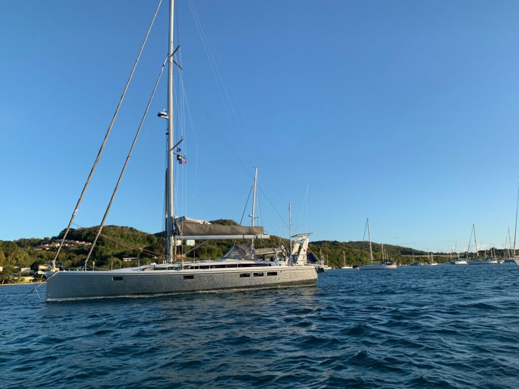 There are fixed and extendable bowsprits for the selection of off-wind reaching sails along with a set of radial cut performance head-sails and a square headed mainsail, all from Incidences, with little mileage, just one east to west Atlantic crossing and a few 12 knot passages between the Caribbean and New England.
