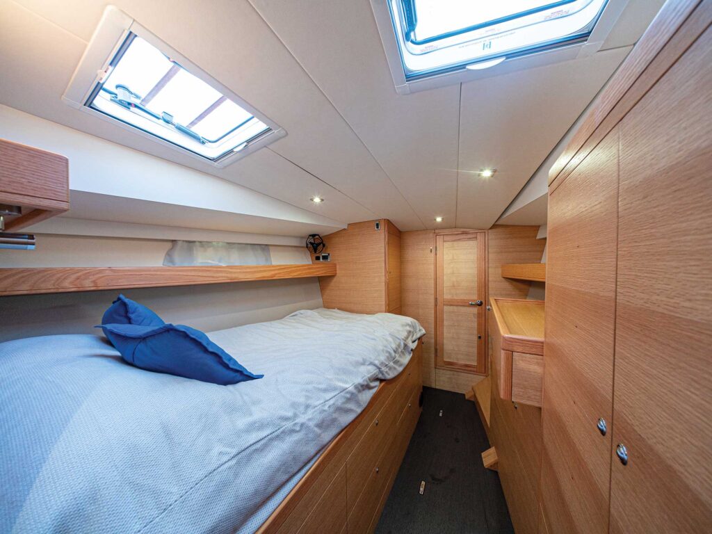 With added stiffness along with twin helms and rudders, Pleione is a high performance long range cruising yacht, easily sailed shorthanded on long offshore passages with comfortable sea berths outboard of the dining saloon in the aft sections and little reason to go forward at sea.